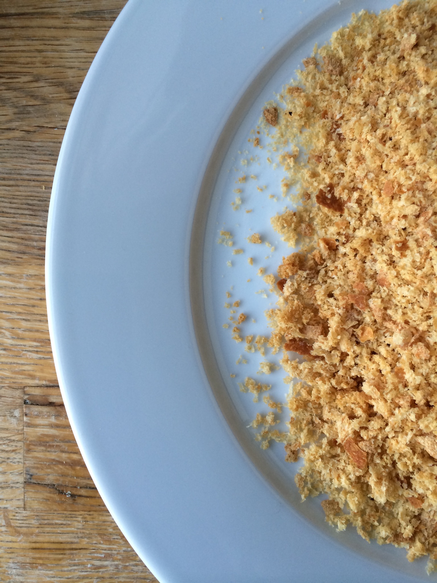 To make toasted breadcrumbs, spread the fresh crumbs in an even layer on a large rimmed baking sheet. Bake in a 350° oven, stirring occasionally, until browned and dry, then transfer hot breadcrumbs to a large bowl.