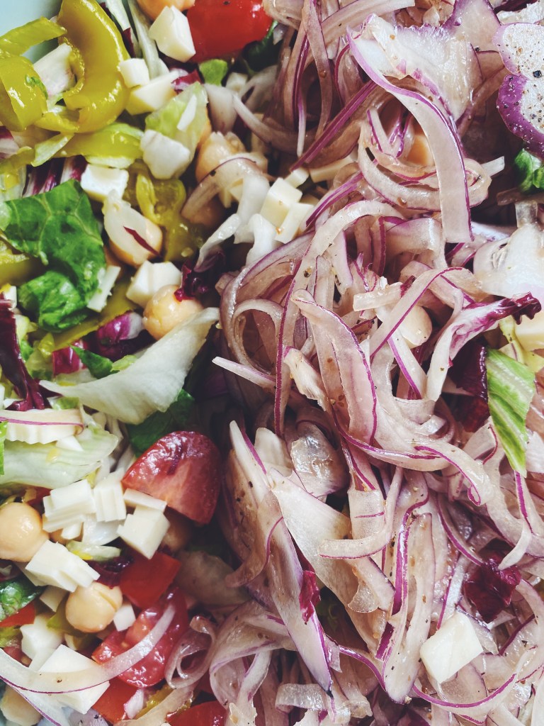 Combine the lettuce, radicchio, tomatoes, chickpeas, provolone, peperoncini and onion in a large, wide bowl. Season with salt to taste, and toss to thoroughly combine. Drizzle 6 tablespoons of the vinaigrette over the salad, then sprinkle with the lemon juice; toss gently to coat the salad evenly. Taste, and add the remaining 2 tablespoons of the vinaigrette, plus salt and/or lemon juice as needed.