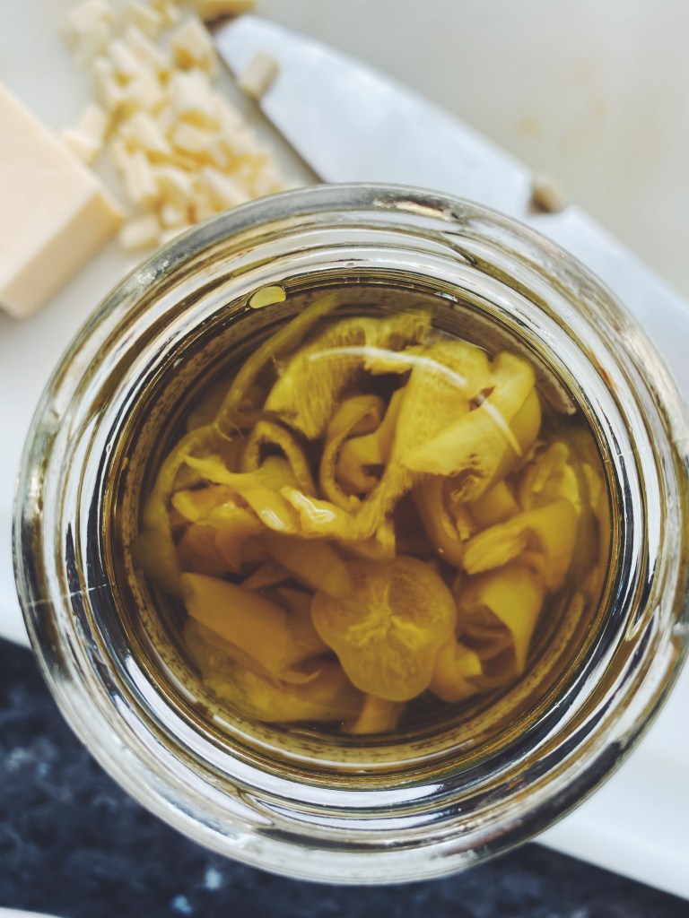 - 5 pepperoncini (stems discarded), cut into thin slices (about 1/4 cup)