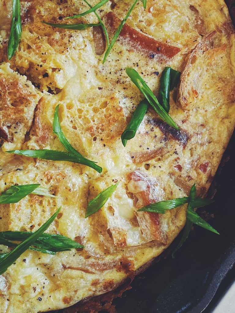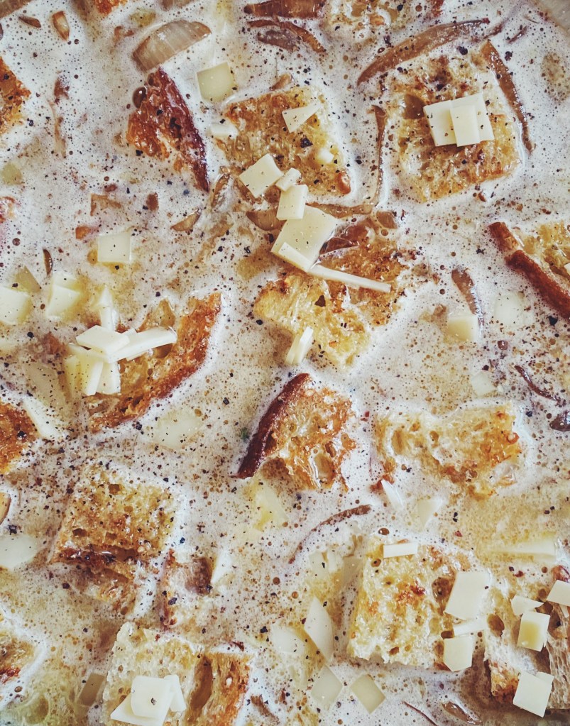 - Whisk together the eggs, milk, mustard, remaining 1 teaspoon salt, and pepper in a large bowl. Stir the remaining butter and croutons into the skillet, then spread in an even layer. Pour the egg mixture over the top. Tilt the pan to make sure the eggs settle evenly. Top with the cheese. Cook until the eggs at the edges of the skillet begin to set, 2 to 4 minutes.