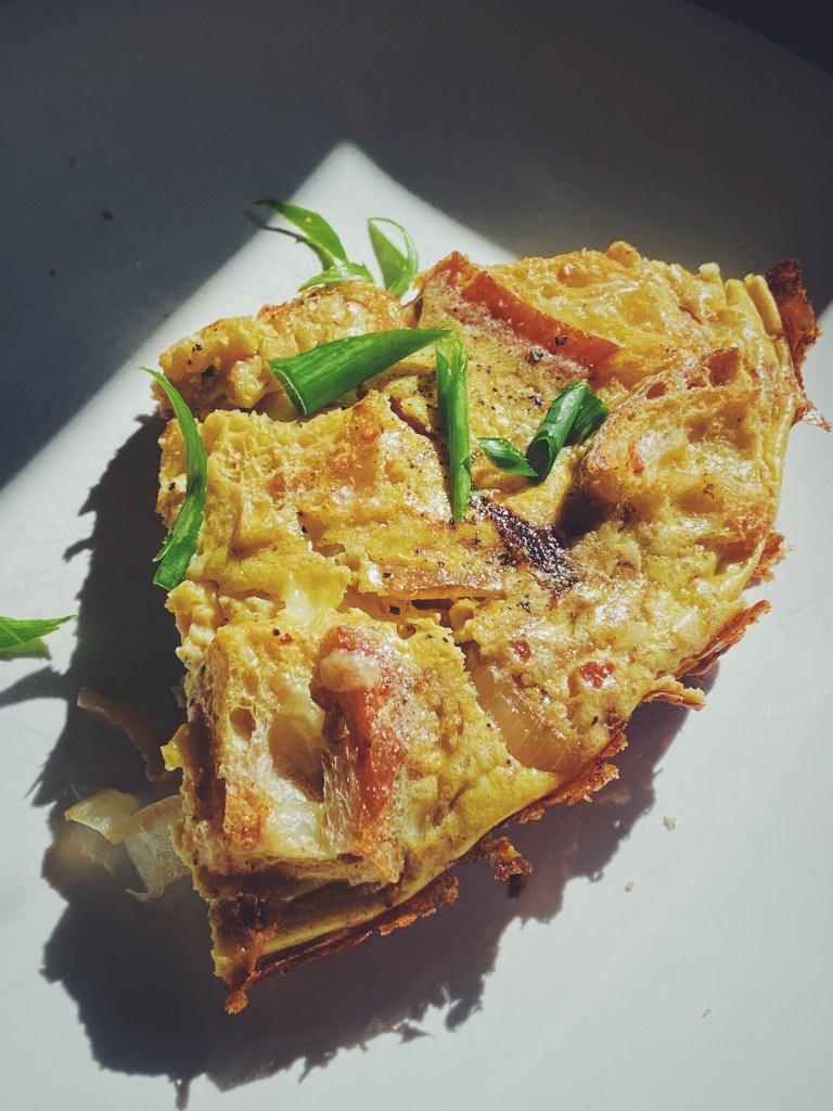 - Cool in the pan for 5 minutes, top with chives, then slice into wedges and serve warm.