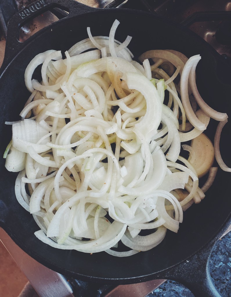 - Reduce the heat to low. Add the oil, onions, and 1/2 teaspoon of the salt to the same skillet. Cook, stirring every 5 to 10 minutes and scraping any browned build-up from the bottom of the pan, until the onions are soft and deeply browned, about 40 minutes total. Add the vinegar and scrape up the browned bits at the bottom of the pan.