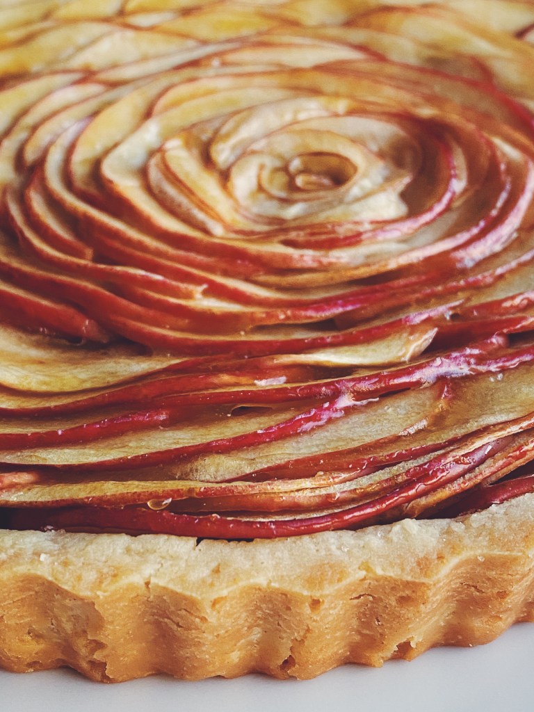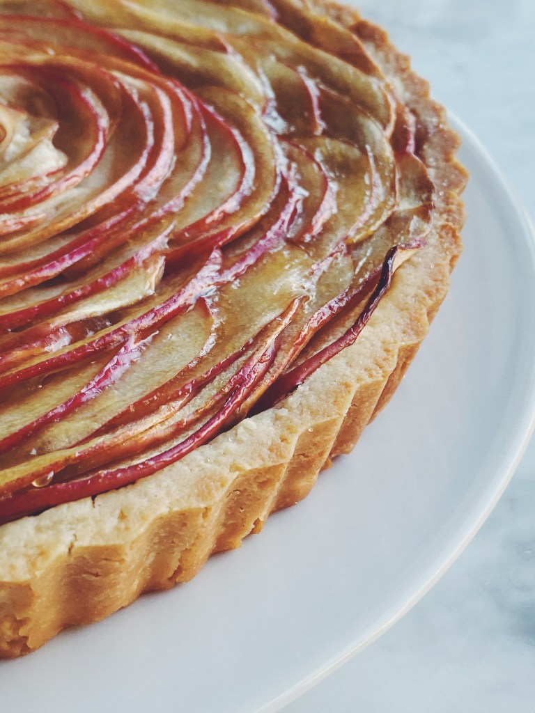 - Cool the tart on a rack for about 10 minutes, then prepare the glaze: In a small saucepan, warm the jam and a few tsp of water over medium-low heat until it is runny. Use a pastry brush to very gently brush the warm tart with jam. Avoid brushing jam on the crust, but a thin layer all over the apple slices. Serve warm or room temperature.