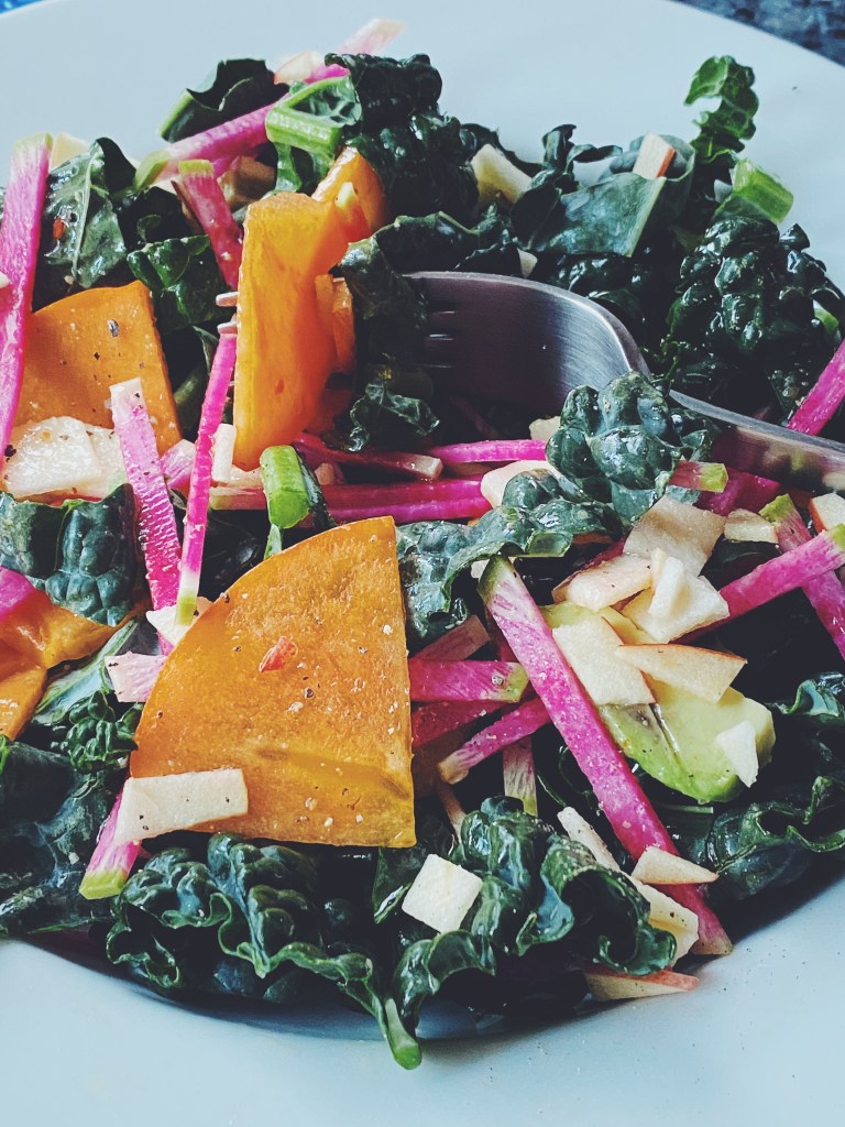 Massage vinaigrette into kale ribbons and let marinate for 10-15 minutes. Toss with remaining ingredients and serve.