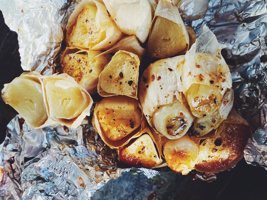 - Preheat oven to 425°. Add tomatoes, into a 13×9″ baking dish; scatter onions and thyme over and drizzle with 1/4 cup oil; season with salt and pepper. Cut of end of garlic to reveal cloves, drizzle with olive oil and wrap in tinfoil to roast. Tuck into the pan with the tomatoes and onions. Roast, tossing halfway through, until tomatoes are jammy, 35–40 minutes.