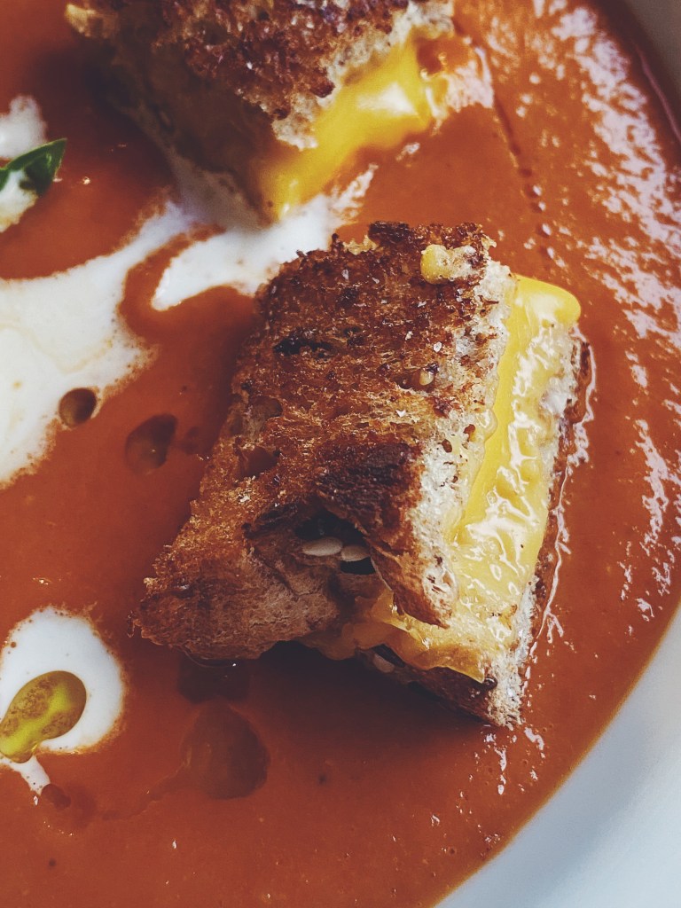 - Meanwhile, toss with bread and remaining 2 Tbsp. oil on a clean rimmed baking sheet; season with salt and pepper. Toast, tossing once, until croutons are golden brown, 6–8 minutes. (Instead of croutons, You can also make a grilled cheese)
