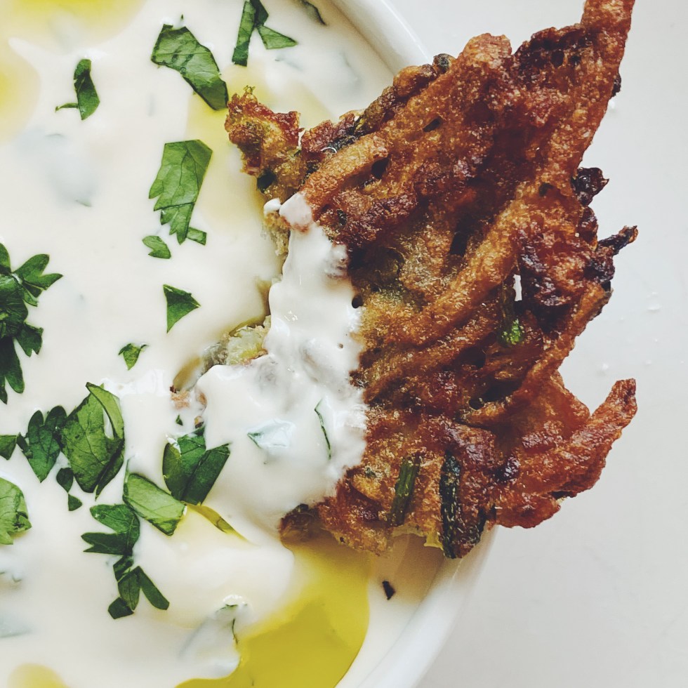 ZUCCHINI HERB FRITTERS WITH GARLIC YOGURT